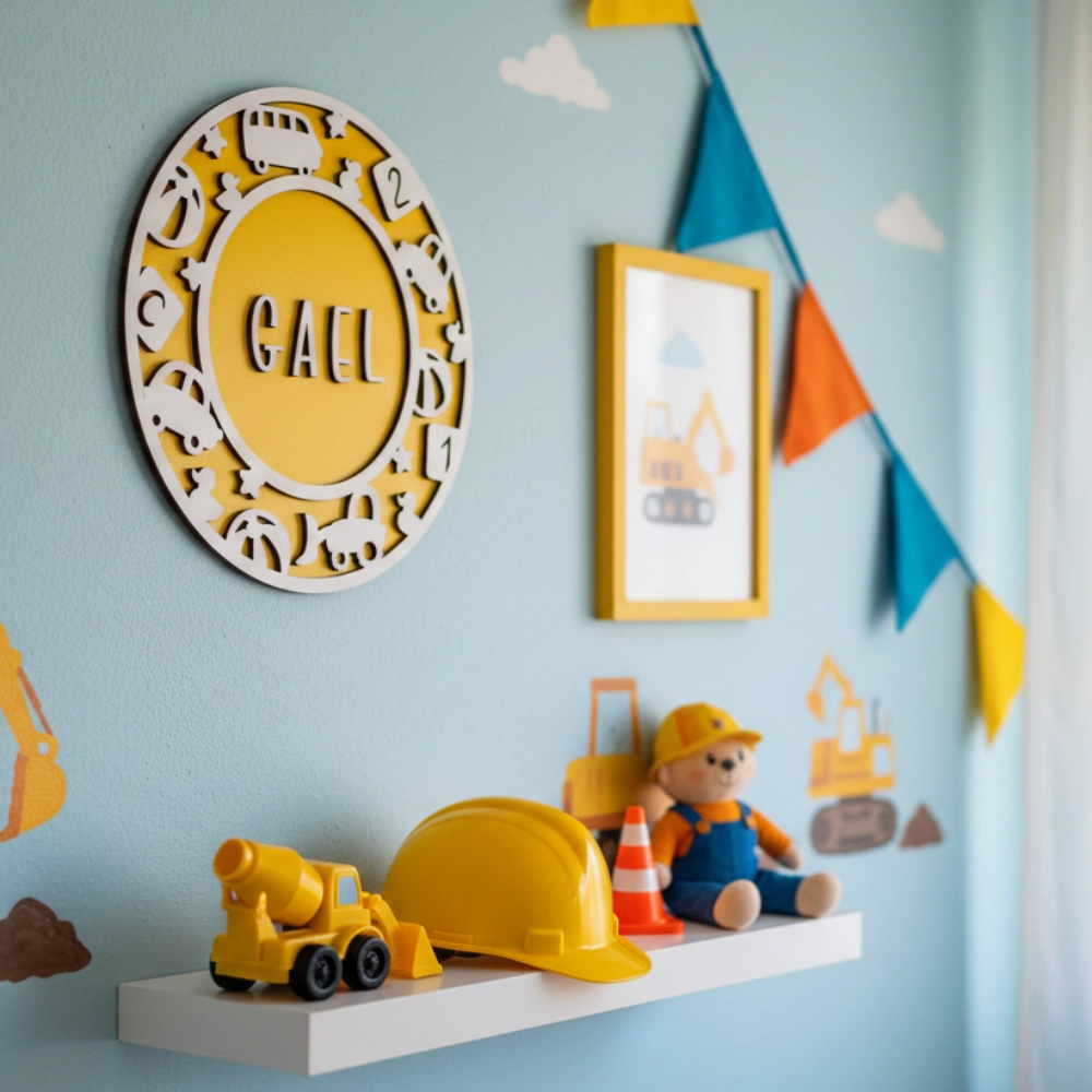 Si tu pequeño se queda fascinado cada vez que ve una excavadora, una grúa o un camión, este cartel es el complemento perfecto para su dormitorio. Con un diseño dinámico y aventurero, transformamos la madera natural en una auténtica zona de obras personalizada que estimulará su imaginación.