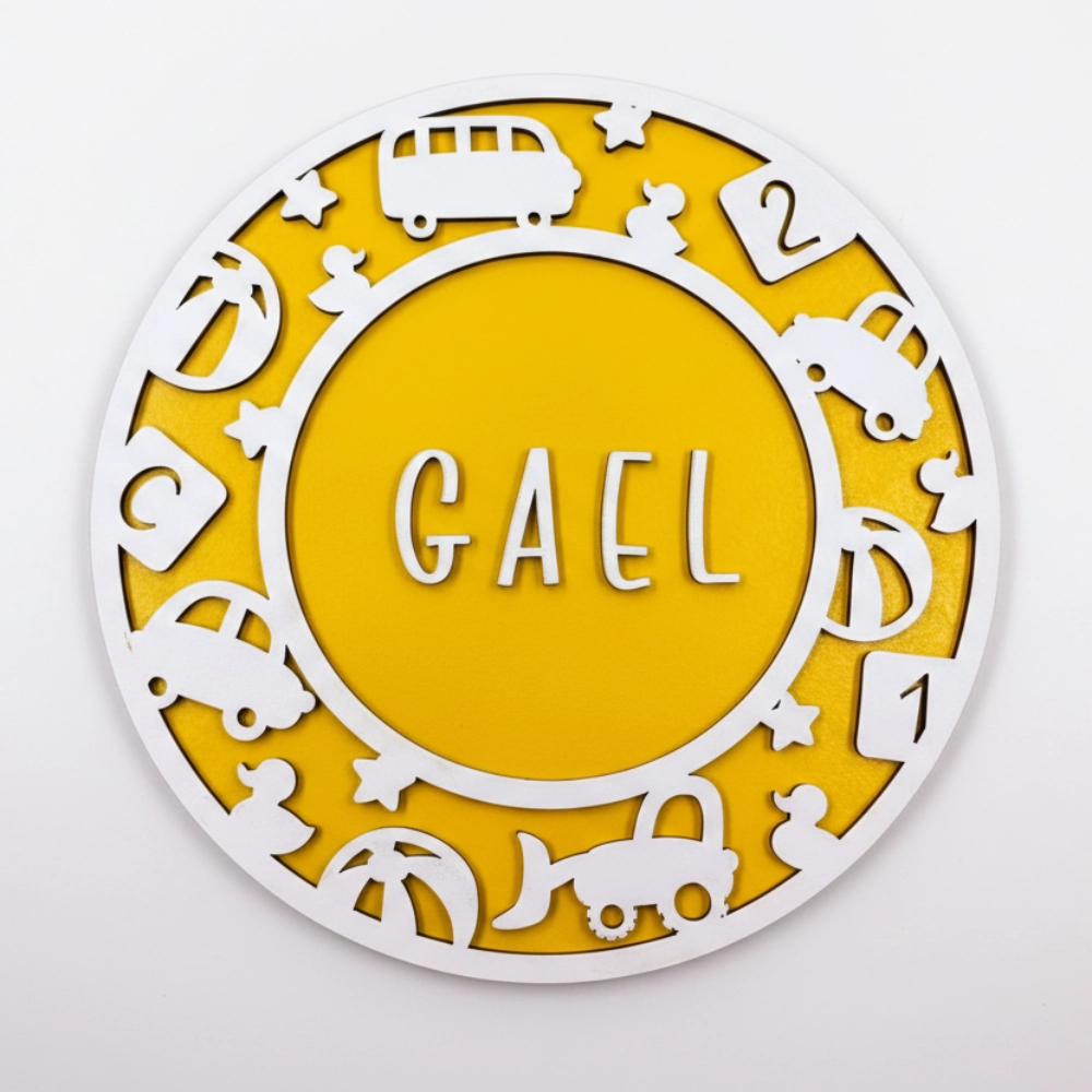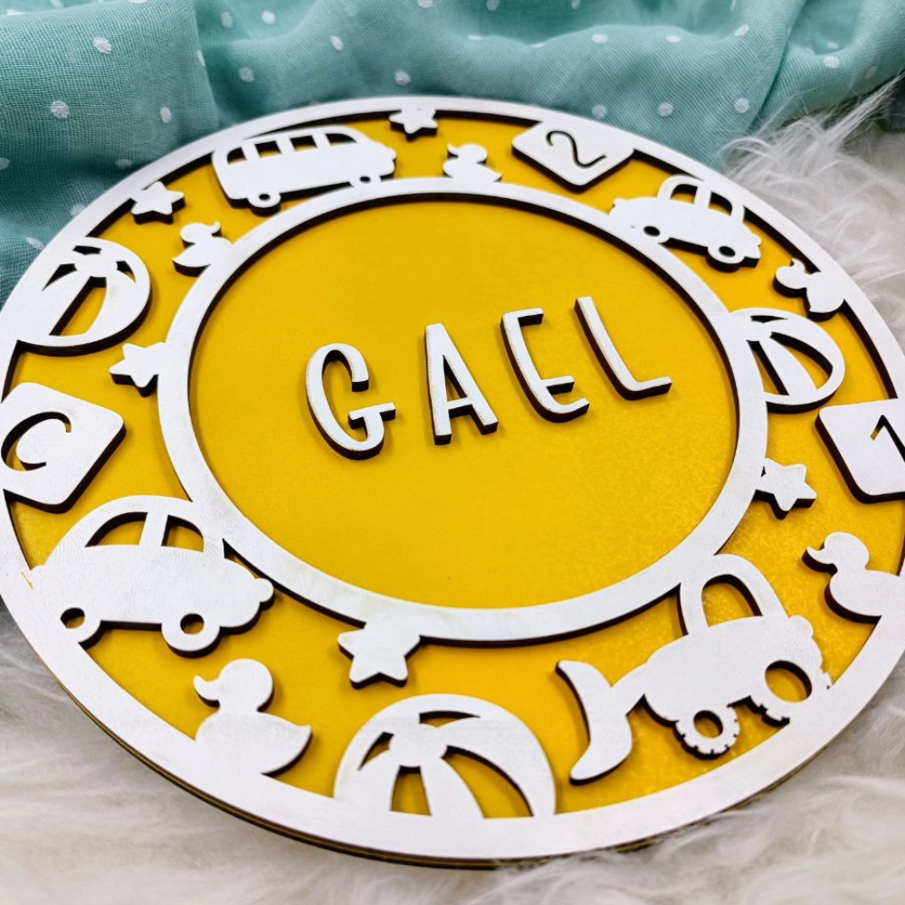 Para los pequeños amantes de las grandes máquinas. Este cartel redondo de madera combina un diseño detallado de obra (camiones, grúas y excavadoras) con el nombre de tu niño o niña en el centro. Un detalle robusto y lleno de personalidad.
