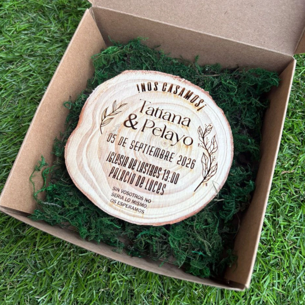 Llevad la esencia del bosque a las manos de vuestros invitados. Esta invitación de boda grabada sobre una rodaja de madera natural es la opción más auténtica y rústica para parejas que aman lo natural. Un recuerdo eterno, artesanal y totalmente único.