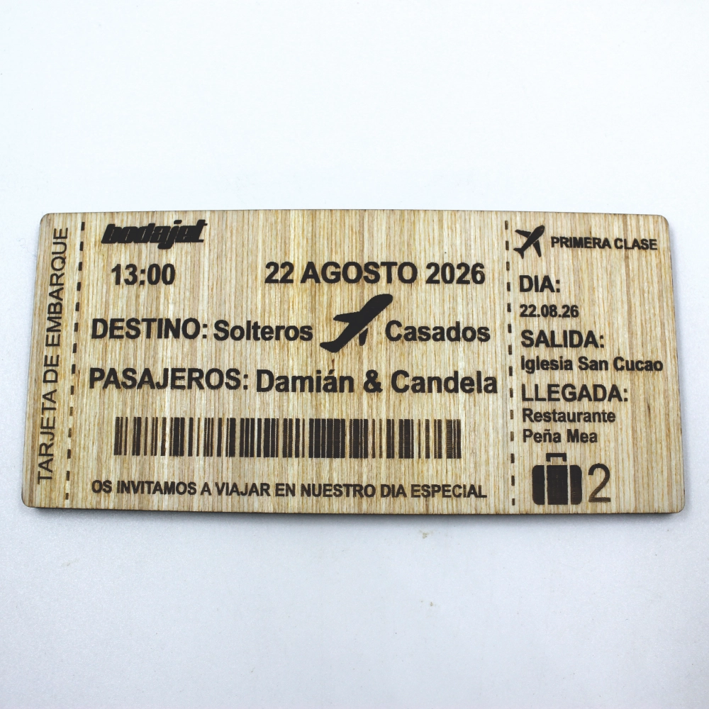 ¡Vuestro amor despega! Sorprended a todos con una invitación de boda con forma de tarjeta de embarque de avión. Fabricada en madera y personalizada con todos los detalles de vuestro enlace, es el comienzo ideal para la mayor aventura de vuestras vidas.