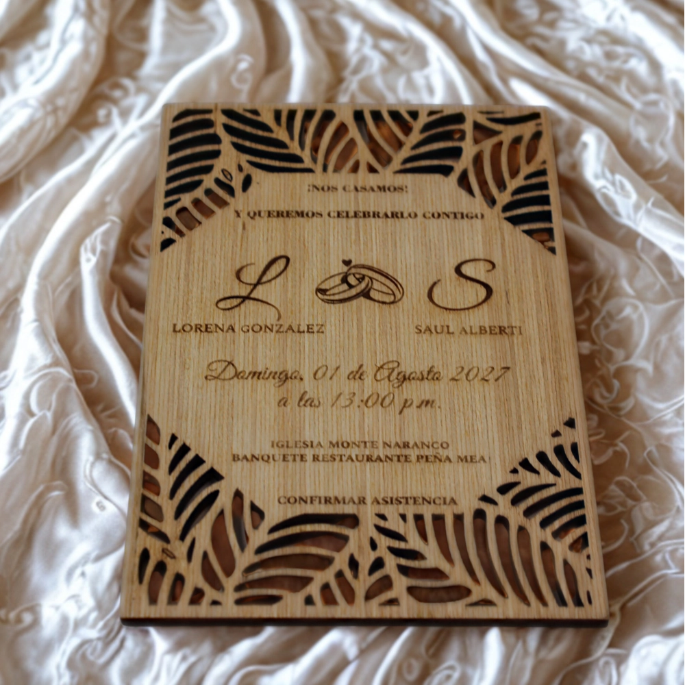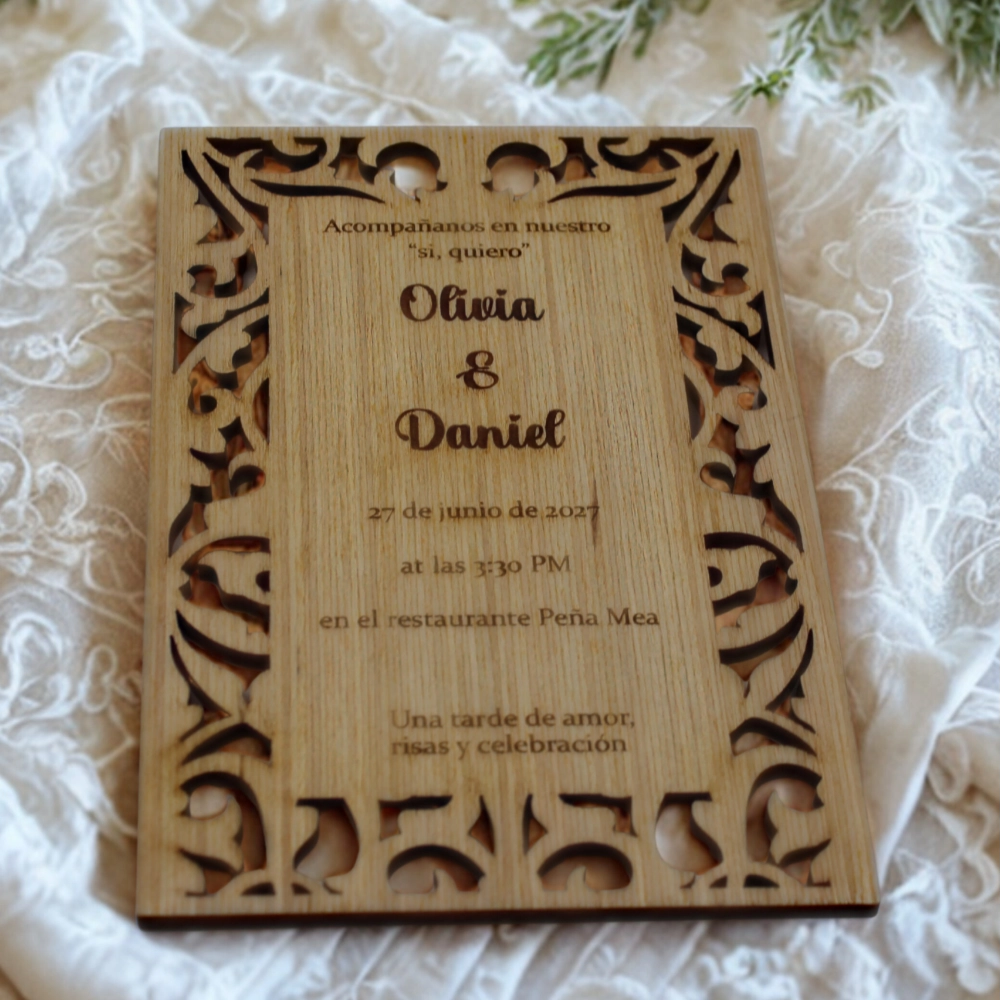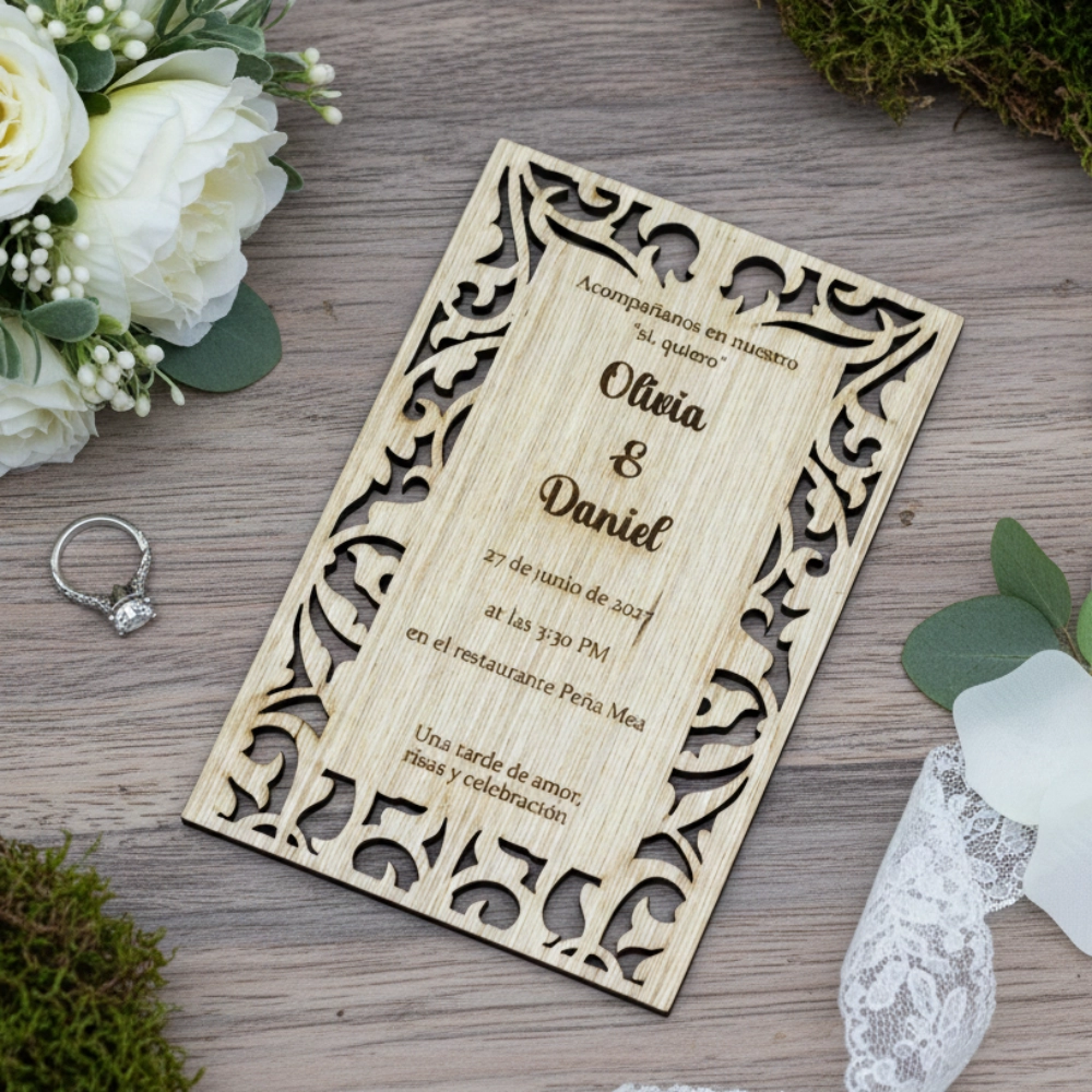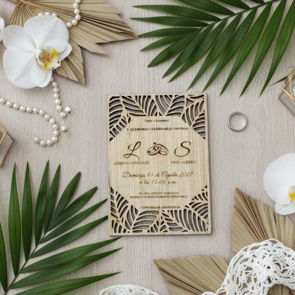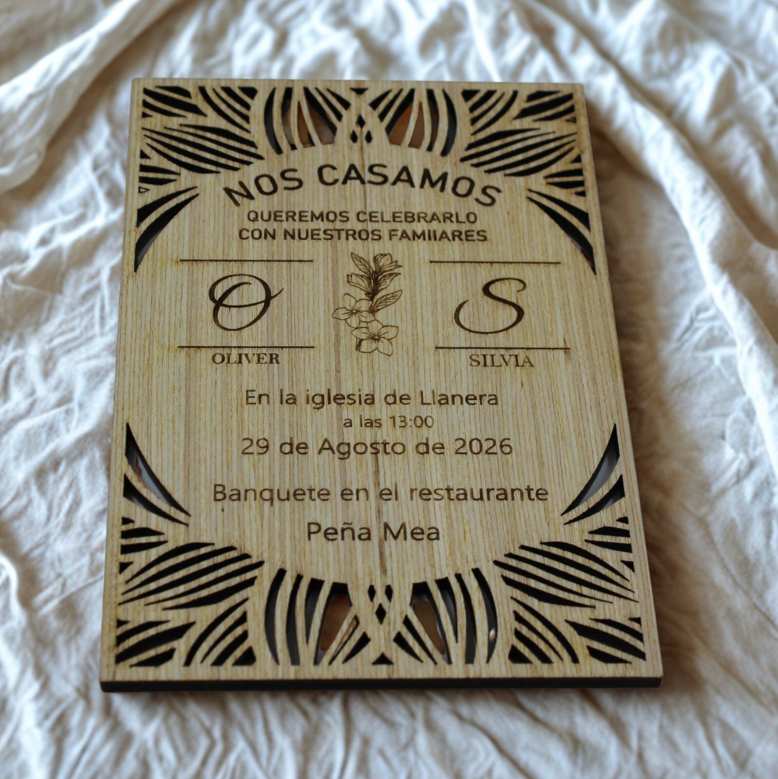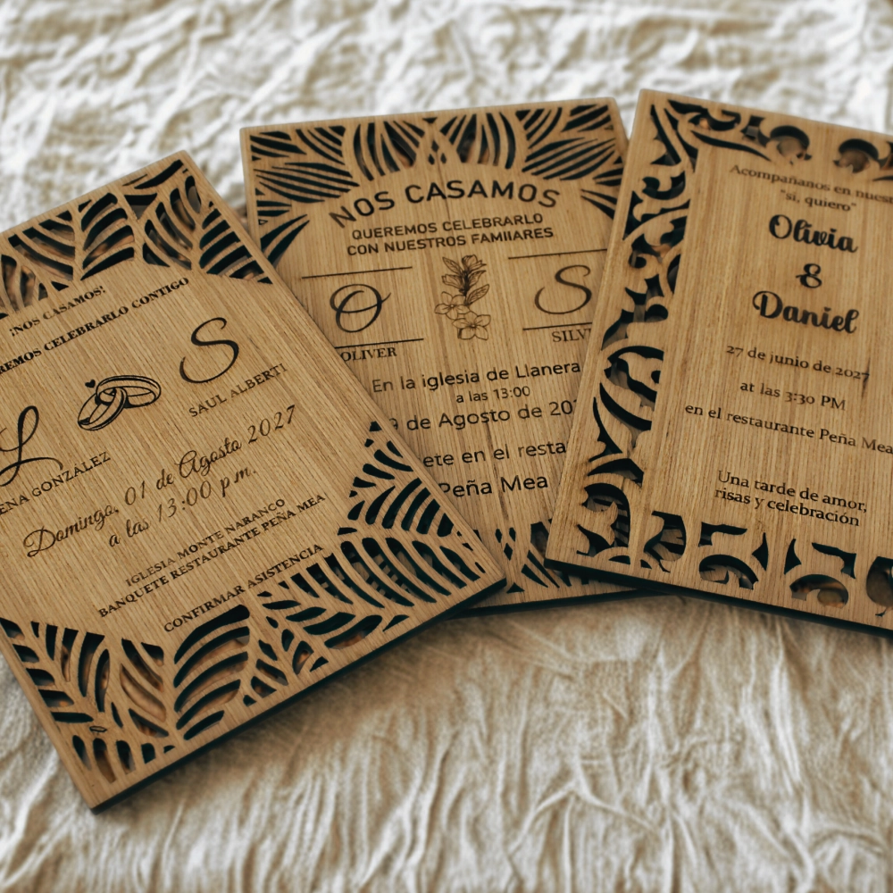 • Ligereza y Rigidez: A pesar de sus delicados calados, la madera de alta calidad asegura que la invitación sea resistente y no sufra daños durante el envío.
