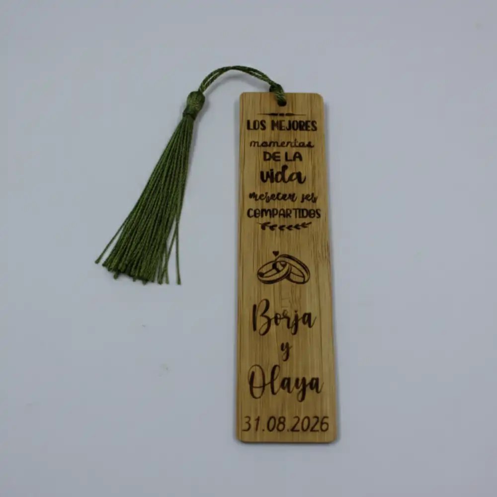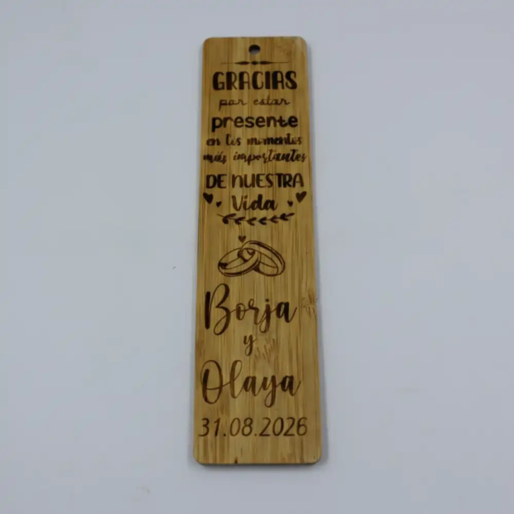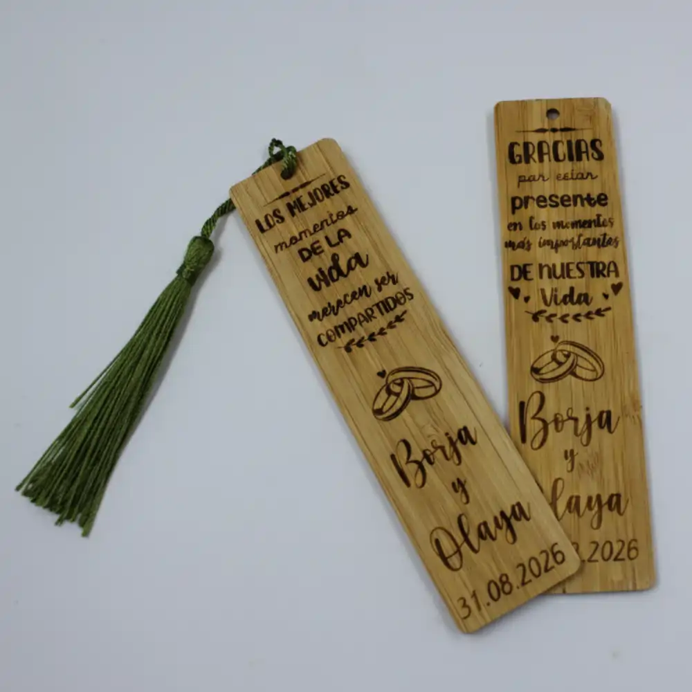 Regalad una historia que nunca termina con nuestros marcapáginas de madera. Personalizados con vuestros nombres, fecha y un mensaje especial, estos puntos de libro grabados a láser son el detalle de boda perfecto: útil, artesanal y con un significado eterno para vuestros invitados.