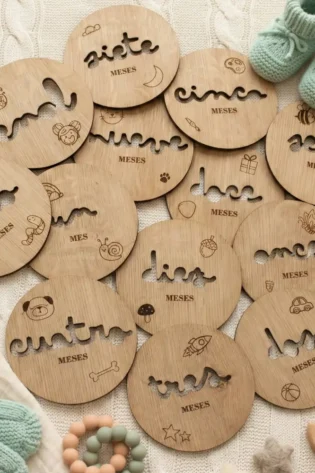 No te pierdas ni un detalle de su crecimiento. Nuestro set de 13 placas cumplemes de madera (6 meses + 1 con su nombre personalizado) es el complemento ideal para tus fotos mensuales. Un recuerdo artesanal, elegante y duradero para celebrar el primer año de vida de tu bebé.